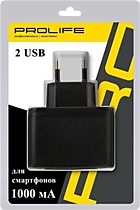 Зарядное устройство Prolife 1000mA адаптировано для сетей 110 – 240 В. Оснащено двумя разъемами USB, благодаря чему с его помощью можно заряжать одновременно два USB-гаджета.